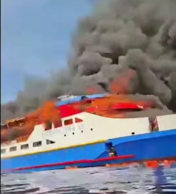 Kapal penumpang KM Barcelona V terbakar saat melintas di perairan Talise, Minahasa Utara, Sulawesi Utara, Minggu (20/7). Kapal ini diketahui mengangkut sekitar 280 penumpang dari Kabupaten Kepulauan Talaud menuju Pelabuhan Manado.