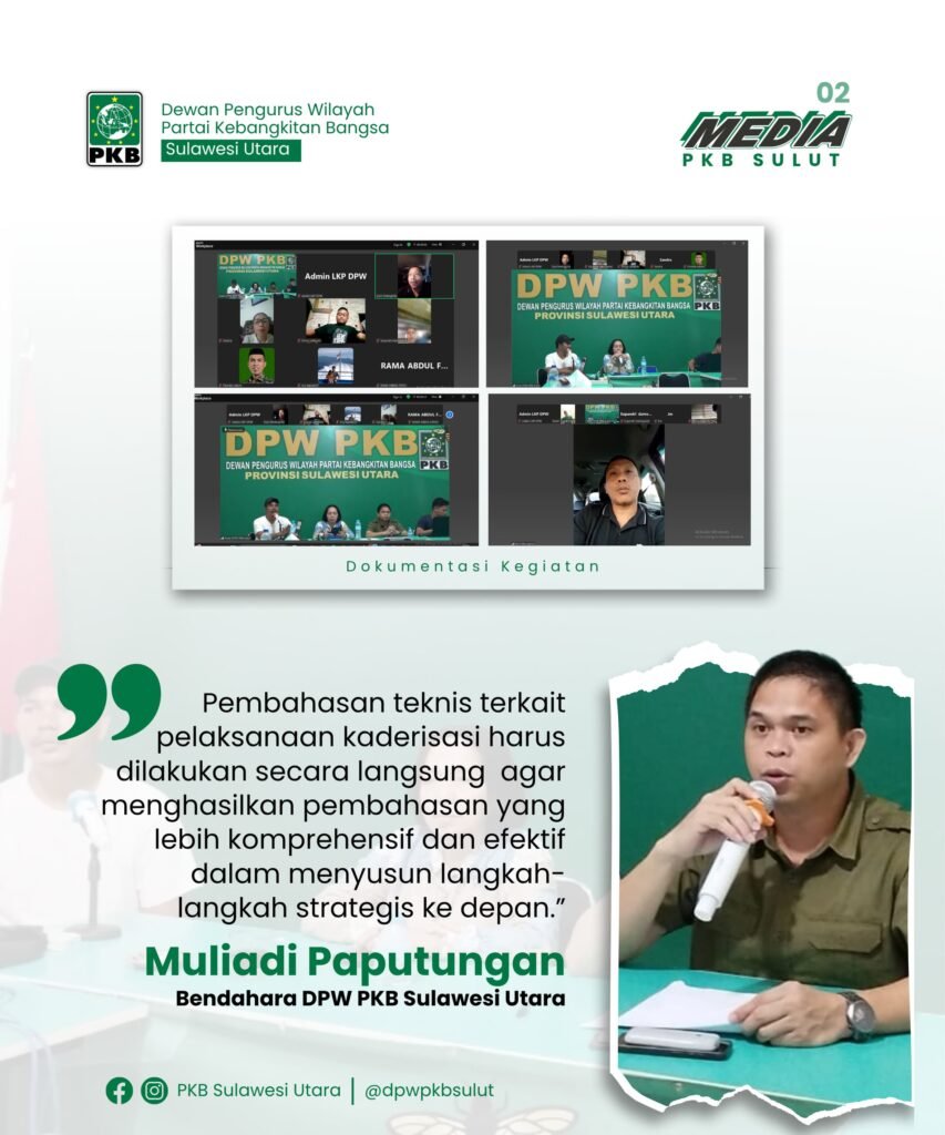 Bendahara DPW PKB Sulut, Muliadi Paputungan, memberikan masukan konstruktif dengan menyarankan agar pembahasan teknis terkait pelaksanaan kaderisasi dilakukan berdasarkan kategori-kategori yang disyaratkan oleh DPP PKB dalam Peraturan Partai.