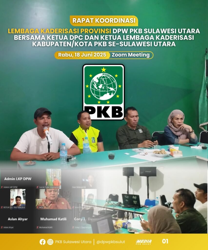 Manado – Dewan Pengurus Wilayah Partai Kebangkitan Bangsa (DPW PKB) Sulawesi Utara (Sulut) melalui Lembaga Kaderisasi Provinsi (LKP) memulai konsolidasi awal dalam rangka pelaksanaan program kaderisasi partai menuju Pemilu 2029. Rapat Koordinasi bersama Ketua Dewan Pengurus Cabang (DPC) dan Ketua Lembaga Kabupaten/Kota (LKK) PKB Se-Sulut Via Zoom Meeting, Pada Rabu, (18/6).